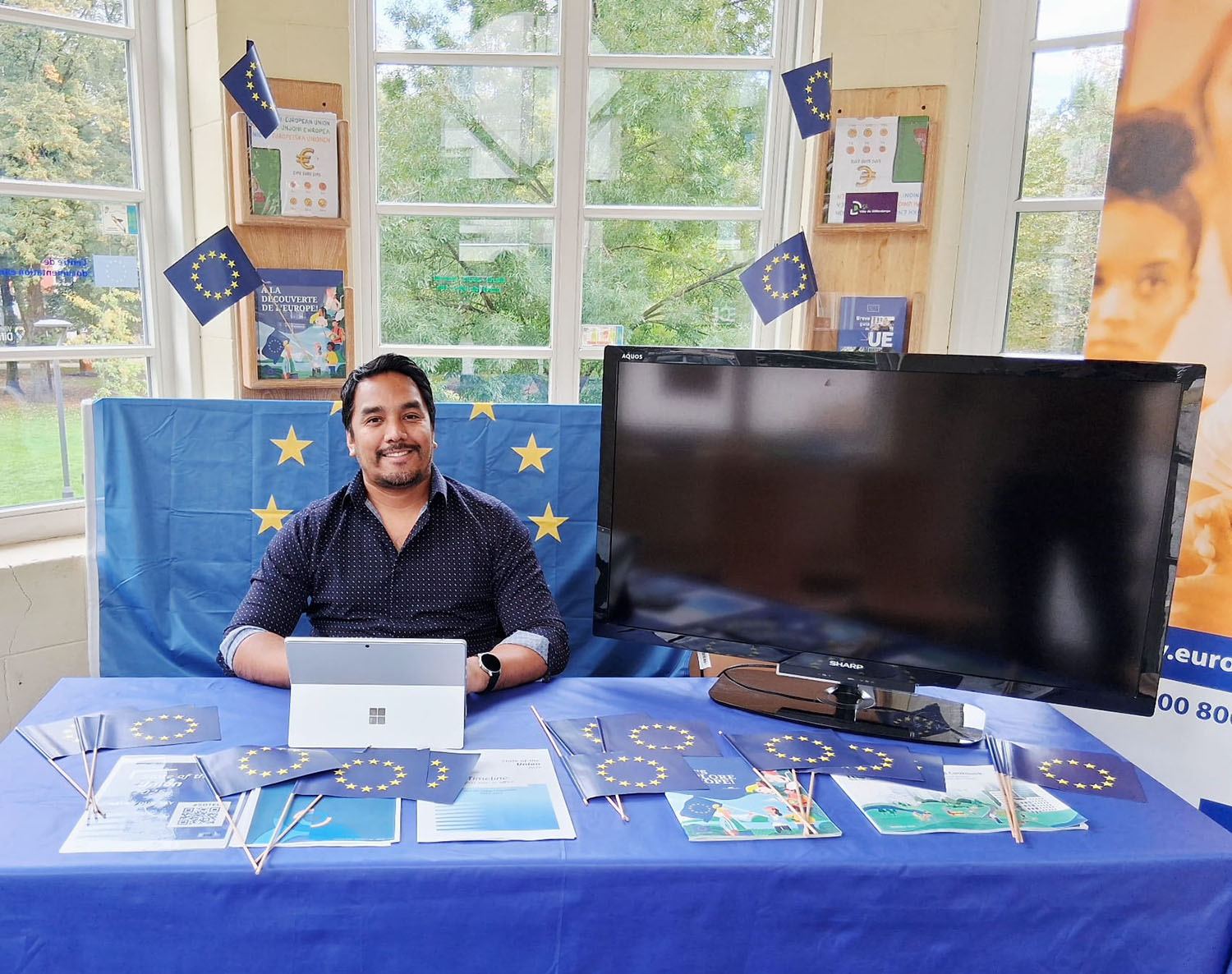 Aujourd’hui, il est heureux d’assister et d’accompagner les visiteurs dans la découverte des opportunités offertes par l’Europe, que ce soit pour les citoyens, les étudiants ou les enseignants.