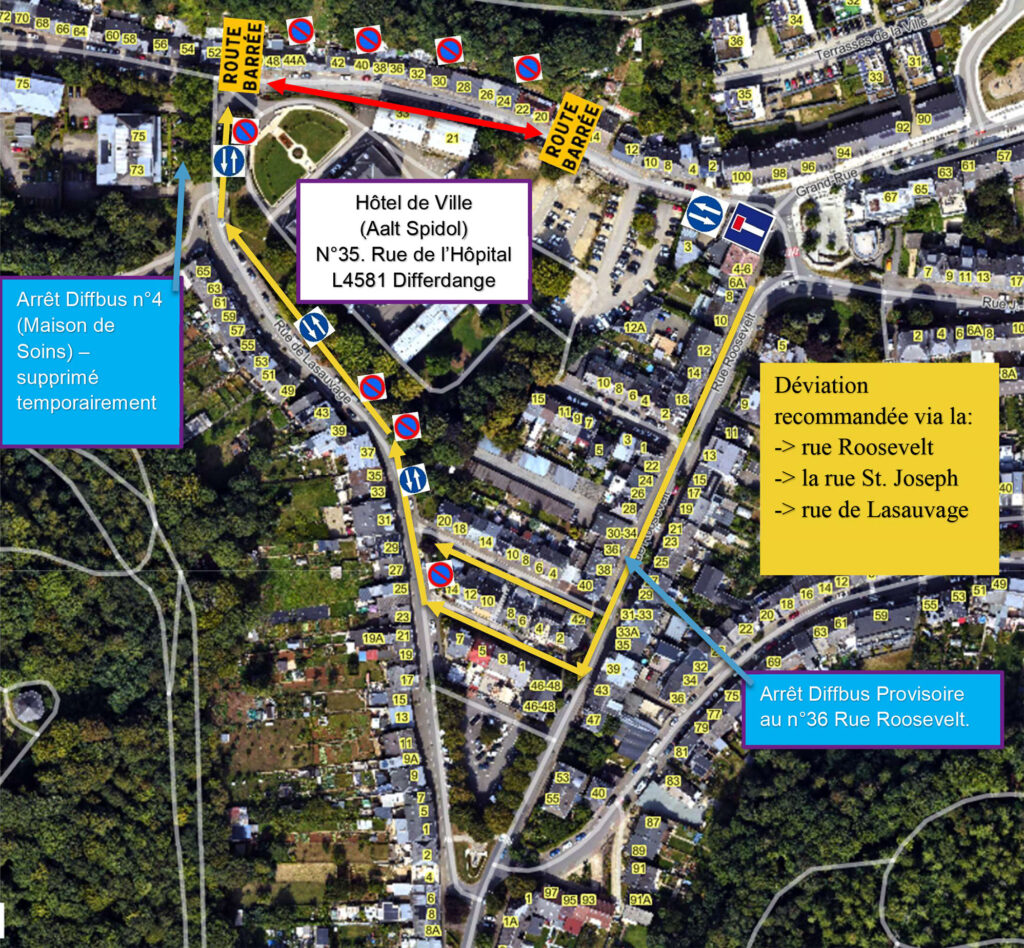 - Die Haltestelle „Maison de soins” des Diffbus 4 wird vorübergehend entfallen. Eine provisorische Haltestelle wird in 36, rue Roosevelt eingerichtet.