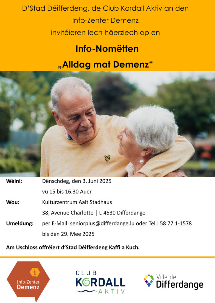 Diagnose Demenz – was bedeutet das für den Alltag von Betroffenen und ihren Familien? Die Stadt Differdingen organisiert gemeinsam mit dem Club Kordall Aktiv und dem Info-Zenter Demenz einen Informationsnachmittag zu diesem Thema. Bei einer Demenzerkrankung stellen sich die Betroffenen und ihre Angehörigen viele Fragen, wie das Familienleben und der Alltag nach einer Diagnose aussehen.
