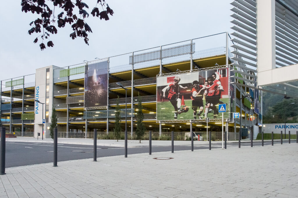 You can use the adjacent Parc des Sports parking garage, where you can park for free for the first hour.