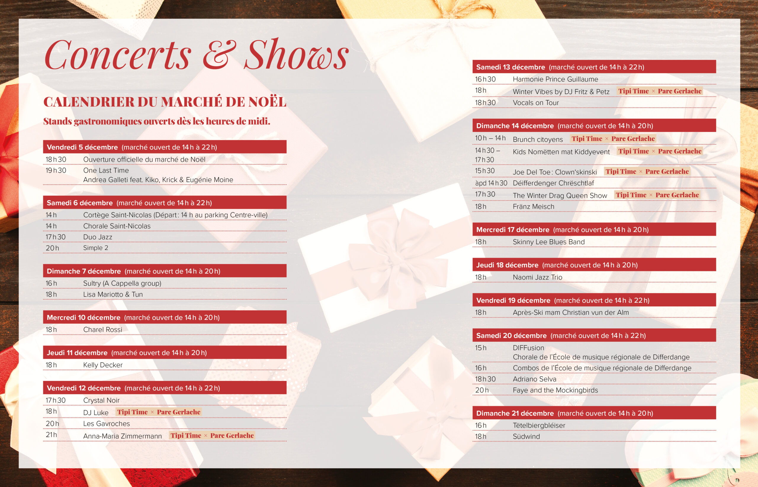 En plus des stands de Noël traditionnels, le marché accueillera une piste de patinage artificielle (détails dans le dépliant), des concerts, un après-ski et un manège.